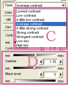You can select a parameter using the settings in section C, or using the sliders in section D to adjust detailed settings. For more details about parameter operations, please refer to the Software Manual.