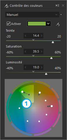| 5 | Cercle chromatique | Ceci permet d'ajuster la couleur en déplaçant le point sur le cercle chromatique. |