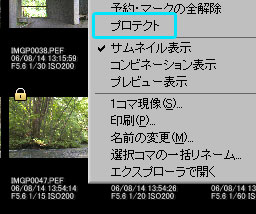 3.4.2. プロテクト SILKYPIXのプロテクトとは、処理対象画像のRAWデータファイルそのものの属性を設定するものではありません。 SILKYPIXのプロテクトは、SILKYPIXの操作の中で、ファイルの移動と削除を禁止し、現像パラメータの変更を禁止します。 プロテクトされているコマは、サムネイル表示やステータス・バーに 「プロテクト」の設定と解除は、サムネイルやプレビュー表示上で右クリックすると表示されるコンテキスト・メニューからおこなうか、もしくは「現像設定」サブコントロールでおこないます。 3.4.3. 前後のコマへ切り替える 操作対象として複数のコマが存在する場合、 3.4.4. 画像の回転 現在選択されているコマの画像を回転します。 3.4.5. 処理対象コマの選別表示 マークをつけたコマや選択されているコマなど、処理対象コマの一部を選別して表示することができます。 コマの選別は2つの方法でおこなうことができます。 メニューの[表示(V)-[処理対象コマの選別]を選択すると表示される「処理対象コマの選別」ダイアログから選別条件を指定する方法と、サムネイル・ウィンドウの右下隅に配置された 「1クリック選別」サブコントロールでは、マークが設定されているコマや選択コマなどを1クリックで選別することができます。 「処理対象コマの選別」ダイアログでは、複数のマークが設定されているコマなど、より複雑な条件でコマの選別をおこなうことができます。「選別表示」の解除もこれらのダイアログやサブコントロールからおこないます。 処理対象コマが選別されると、タイトルバーには、「選別表示」と表示されます。 「選別表示」モードでは、選別されていないコマは一時的に処理対象からはずされます。「選別表示」を解除すると、すべてのコマが処理対象コマとなる状態に戻ります。 ファイルやフォルダを新たに開いたり、追加して開いた場合には、自動的に「選別表示」は解除されます。 「選択コマを閉じる」機能でコマを個別に閉じる場合には「選別表示」は維持されます。 3.5. パラメータ・コントロールやサブコントロールの配置 パラメータ・コントロールやサブコントロールはフローティング・ウィンドウとして画面に配置することができます。 フローティング・ウィンドウをドラッグして配置位置を調節する場合、近くに他のフローティング・ウィンドウが存在する場合に自動的にフローティング・ウィンドウを並べる機能が働きます。 自動的に並べられたフローティング・ウィンドウはグループとして一括して移動することができます。 これらの機能を活用して、作業しやすいようにウィンドウの配置をカスタマイズしてみてください。 3.5.1. パラメータ・コントロールの配置 「パラメータ・コントロール」は、メイン・ウィンドウ内部の左右のいずれかに配置するか、フローティング・ウィンドウとしてメイン・ウィンドウの外に配置するかが選択できます。 3.5.2. コンビネーション表示モードでのサムネイル・ウィンドウの配置 設定方法ついては、「9.2.2. パラメータ・コントロールの表示形式」をご参照ください。 コンビネーション表示モードでは、プレビュー・ウィンドウとサムネイル・ウィンドウの両方が同時に表示されます。 3.5.3. サブコントロールの配置 この場合のサムネイル・ウィンドウの表示形式は、メイン・ウィンドウ内部の上下左右ずれかに配置するか、フローティング・ウィンドウとしてメイン・ウィンドウの外に配置するかが選択できます。 設定方法ついては、「9.2.3. サムネイル表示」をご参照ください。 現像パラメータを編集するためのサブコントロールは、「パラメータ・コントロール」内の「タブ・ページ」や「コントロール・ボックス」に配置するか、「フローティング・ウィンドウ」とするかの選択ができます。 3.5.4. フローティング・ウィンドウのグループ化 表示方式の変更は、タイトル・バーを右クリックするか、もしくは