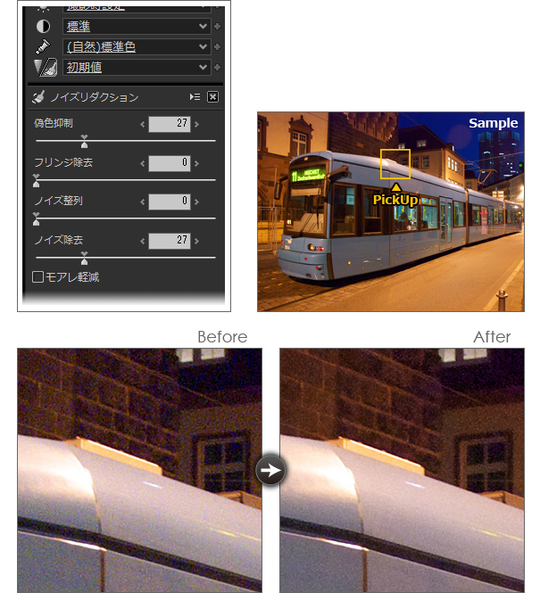 細かな構造の部分に発生する偽色や暗部に赤や緑の色づきが現れる「色ノイズ」、高感度撮影時にざらざら感が生じる「輝度ノイズ」を除去する機能がノイズリダクションです。※以下の作例はDSP6またはDSP5を使ったものとなります。