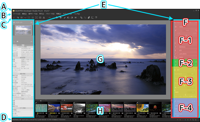 0.1. 各部名称 SILKYPIX®の画面表示の各部位の名称や操作方法の概要について説明します。 0.1.1. SILKYPIXの全体画面 ![]() SILKYPIX®の画面は、以下の要素で構成されます。