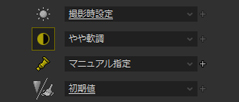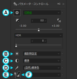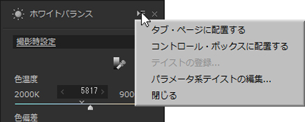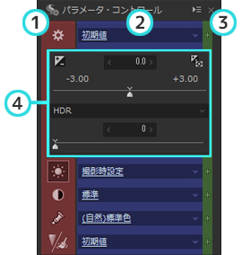メインウィンドウの左右それぞれにコントロールが配置可能なボックスのことを指します。 インフォメーションボックスは、それぞれ上部と下部に分かれており、上部のボックスには「ナビゲーター」「ヒストグラム」を配置できます。 また、下部のボックスには、「フォルダツリー」「パラメータ・コントロール」「画像のプロパティ」を配置できます。 0.1.5. パラメータ・コントロール 現像パラメータを調整するためのさまざまなコントロールが配置されたボックス全体を指します。 ボックス内には複数のコントロールを配置する事が可能となっており、それぞれのコントロールに合わせて、タブ・ページ、または、コントロール・ボックスに配置されます。 コントロールの配置の変更はコントロール右上にある をクリックすると表示されるコンテキスト・メニューにておこないます。配置の変更方法の詳細は、「0.1.7. コントロールの配置方法」をご覧ください。 メイン・コントロール部のパーツをパーツの種類として分類した場合、以下の4つに分類されます。 0.1.6. 現像パラメータ調整のためのサブコントロール 現像パラメータの調整を行うサブコントロールは、初期状態ではタブ・ページ、または、フローティング・ウィンドウとして表示され、各カテゴリに個別に用意されています。(*1) 0.1.7. コントロールの配置方法 サブコントロールは、コントロール・ボックスに配置することもできます。 サブコントロールでのパラメータの選択/調整は、おもにスライダーとエディットボックスで構成される数値の調整のためのコントロールと、ドロップダウンリスト、チェックボックスで構成されています。 操作方法については「0.1.8. GUIの操作方法」をご参照ください。