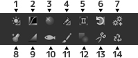 0.1.6.2. サブコントロール・アイコン パラメータ・コントロールの下部にあるサブコントロール・アイコンから選択できるサブコントロールを以下に示します。 サブコントロール・アイコンから表示したサブコントロールは、初期状態ではフローティングウィンドウとして表示されます。 編集されたサブコントロールのアイコンには右図のように色が付きます。