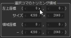エディットボックス、そして数値を変更するボタンから構成されるSILKYPIX® Developer Studio Pro8 / SILKYPIX® Developer Studio 8の標準GUIの1つです。 トリミング領域設定などで使用されています。