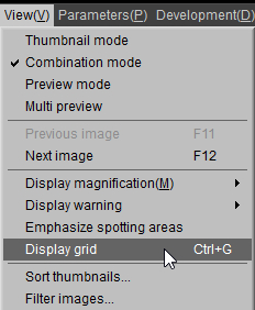 It processes data as well as the development preview except for the above description. Therefore, "exposure bias", "white balance", "tone", and "saturation" is reflected also in the coarse preview. 3.2.5. Development Preview Until development preview processing has been completed, two types of "preview images" are intermingled.While the mark is displayed at the right end of the status bar, it indicates that the development preview processing is still under operation and there still remains the result of coarse preview.When development preview processing is completed, the mark disappears and it indicates that the whole "preview image" has been replaced to development preview". Then you can check the final development result on the screen.If you select "Fast rendering (Coarse preview)" from the "Preview rendering method" dropdown list on the "Display settings" dialog, SILKYPIX does not display a development preview when a smaller preview image than its actual size is displayed. It provides you to reduce the memory consumption and the load of CPU when updating a preview image. This setting is effective for the PC that has few built-in memories or a notebook PC. Please refer to '9.2.3. Preview window'. 3.2.6. Grid Display You can display the grid on the preview image in the "Preview mode" or "Combination mode". Selecting the menu command [View (V)]-[Display grid] turns the grid on or off. Even when the grid display is OFF, the grid will be automatically displayed for a set time period while adjusting the "Rotation/Shift lens effect" category in development parameters. Please refer to "9.2.3.3. Grid Settings" concerning settings in this function. 3.2.6.1. Moving Grid Position On the Preview window, you can grab and move the grid by the [Ctrl] key + drag operation. In addition, the [Ctrl] key + left-double-clicking reset the grid to the initial position. 3.2.6.2. Grid settings While displaying the grid, the "Grid settings" dialog appears. You can configure the interval and position of the grid on the dialog, and reset the grid to the initial position, too.