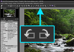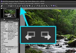 When the same image is displayed on the main preview and the reference preview, you can return or go forward to previous development parameters for the image displayed in the Reference Preview with the two icons, and on the Icon Bar.In addition, by clicking on The preview display comes with functions for changing display position and magnification for checking parts of the image with the mouse in the preview display. The aims of mouse operations in the preview display are switched in tool mode. Be sure to select one of the following tool modes for changing display position and magnification: "Fitted display", "Zoom tool", "Loupe tool (zoom in)", "Loupe tool (zoom out)" and "Palm tool". "Fitted display" is a mode that fits the entire image in the display. The other four tools can be used to change display position and magnification through their own methods. 3.2.2.1. Changing preview display position and magnification There are several ways to change preview display position and magnification. 3.2.2.2. Change display position / magnification with the mouse Methods other than changes through mouse operations on the preview display will be explained here.