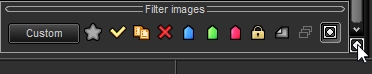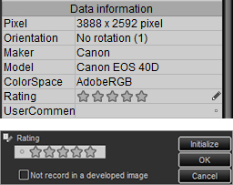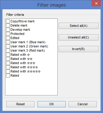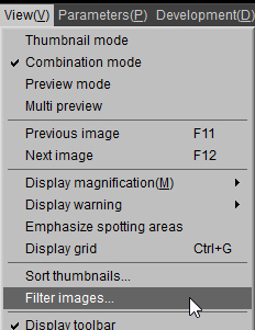 To clear marks from an image, right click on a thumbnail of a marked image to display a context menu.Select "Reset all marks" to delete all set marks. To cancel individual set marks, select a mark for deletion from the context menu. Furthermore, you can also set and clear marks, other than "Rating" (*1), by selecting icons located on the status bar. A maximum of six kinds of marks can be set to a single image.The following combinations can be set. (A) Delete mark or Copy/Move mark *1 See "3.4.3. Rating" for details concerning how to set "Rating."(B) Develop mark (C) User mark 1 (Blue mark) (D) User mark 2 (Green mark) (E) User mark 3 (Red mark) (F) [Maximum 5] Ratings (*2) *2 When the image width on two thumbnails is under "129 pixels," "Rating" is not displayed. 3.4.2. Protect SILKYPIX protect is not for setting attributes of the RAW data file image for processing. 3.4.3. Rating SILKYPIX protect prohibits moving or deleting files and changing development parameters during SILKYPIX operations. Protected images are displayed with in thumbnail displays and on the status bar.To cancel the "Protect" setting, right click on the thumbnail or preview display and use the context menu, or use "Development settings" "sub-control. You can set the class of images by setting the number of stars with "Rating." In addition, you can sort set ratings with " "Filter images," "Sort thumbnails," etc. You can save additional information when set "Ratings" are saved on JPEG/TIFF image files.(*) * See "9.1.4. JPEG/TIFF options," "(3) Discard SILKYPIX parameters and image information" regarding details on how to make settings on JPEG/TIFF image files. 3.4.3.1. Setting and Clearing "Ratings" Thumbnail modeSet the number of stars by clicking on or dragging under each image in thumbnail window.Click to clear the set stars.* When performing batch operations on multiple images * You can set the number of stars on all images in a selected batch by clicking on or dragging under any of the images when multiple images are selected.You can clear the number of stars on all images in a selected batch by clicking on under any of the images when multiple images are selected. Preview modeBy right clicking on the preview, you can select and set the number of stars from the menu items at "Set rating." Remove the set stars by selecting "Clear." Image propertiesThe "Rating" window opens when you align the mouse pointer with "Rating" under "Image properties" and click on .Click to set the number of stars. Click to return the set number of stars to the number of stars embedded in the image. In addition, if you click , the setting of number of stars will return to default, so the number of stars will return to the number of stars embedded in the image. = When set rating is not reflected in development (saved) results = When you set the number of stars with a check at "Not record in a developed image" and click the [OK] button, this rating will not be recorded when developing.In addition, under conditions when the number of stars is not set, "Not record in a developed image" is unavailable, and it cannot be used. Therefore, this item is unavailable even if you click to set the number of stars to default.When you click the [OK] button, the set contents is reflected on the "Rating" and the "Rating" window closes. If you click the [Cancel] button, the contents you were operating on will not be reflected and the "Rating" window will close. You can filter and display images according to the set rating. 3.4.3.3. Sort thumbnails by "Rating" See "3.4.6. Filtering images for processing" concerning filtering images. You can sort thumbnails according to rating. See "3.3.2. Sort Thumbnails" concerning how to sort thumbnails. 3.4.4. Switching to previous / next image If there are multiple images being operated on, click on to go to the image prior to the currently selected one or on to go to the next image. 3.4.5. Rotating images Rotate the image of the currently selected image. The image is rotate left when you click on and rotate right when you click on . 3.4.6. Filtering images for processing You can filter images for development, such as marked images and selected images. There are two ways you can filter images. One method is by selecting [View (V)]-[Filter images] from the menu and designating filtering conditions from the "Filter images" dialog. The other is by moving your mouse over the You can filter marked images and selected images with one click in the "Filter images" pop-up window. You can filter using more sophisticated conditions, such as images with multiple marks, in the "Filter images" dialog.Canceling the "Filtering images" is also done from these dialogs and pop-up window. When images for processing are filtered, "Filtering images" will be displayed in the title bar. In "Filtering images" mode, images not filtered will temporarily be removed as subject to processing. When "Filtering images" mode is cancelled, all images will return to status as images for processing. "Filtering images" will be automatically cancelled if a new file or folder is opened or if added and opened. "Filtering images" will remain open if images are individually closed with the "Close selected images" function. 3.5. Arranging parameters controls and sub-controls Parameters controls and sub-controls are located to either side of the main window, the tab page and control box. You can freely change the location such as displays in windows independent of the main window. If you drag a floating window and adjust its position, and if another floating window is nearby, a function that automatically arranges floating windows will come into play. Automatically grouped floating windows can be moved as a group. Changes to display methods are performed through the context menu displayed by clicking at the upper right of each sub-control.Please see "0.1.7. How to Locate Controls" concerning context menus. Utilize these functions to customize the arrangement of windo