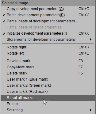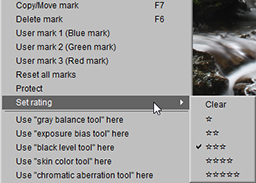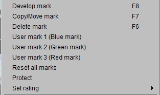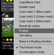 3.4. Operations for selected images 3.4.1. Marks You can make marks for operating and managing images. By right clicking on a thumbnail or preview image, a context menu will appear, from which you can select marks and clear marks.