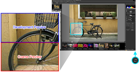 3.2.3. Displays of images with default parameters by mouse operations You can check images with the default parameters during adjustments in the "Combination mode" or "Preview mode." 3.2.4. Coarse Preview When displaying an adjusted image on the preview window, line the mouse pointer with on the bottom right corner of the preview window, click on , and while is pressed, the image with the default parameters will be displayed. ![]() The preview display in the preview window can perform concurrent processing in two formats, the coarse preview that performs simple development processing for quick display of the whole, and the development preview for development processing the exact same as the output image of development results. If this software need to update the preview display, first use the quick coarse preview. In the background, parallel processing of partial development preview is performed at the same time. It is updated as display blocks that have completed development preview processing are automatically replaced. If selected images are switched and development parameters are changed, it may seem at first that the image display is a little rough, but you will understand as details of the image change in order. When changing development parameters, it is possible to confirm the process at different stages displayed in the coarse preview without having to check the results of development preview processing. In the coarse preview, the following processes are performed to speed up.