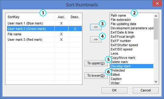 You can specify the order of the sorting key on this list. The sorting key is applied in turn from top of the list. "Ascending order" displays in order from small values to larger values, but if marked, set images are displayed first and images not set displayed after those. "Descending order" is displayed in reverse order to "Ascending order." And you can specify whether ascending order or descending order to each sorting key.