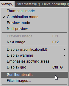 You can change the representative image by pushing the [Up] or [Down] key. The above operations are the same whether selecting images from multiple rows or multiple columns.Please note that if you push the [Left] or [Right] key that multiple image selection mode will be cancelled. You can specify the display order of the thumbnail. 3.3.3. Changing the Size of Thumbnails Using the menu command [View (V)]-[Sort thumbnails] or clicking the [Sort thumbnails] button on the "Display settings" dialog. Set rules for arranging thumbnails in the order you prefer in the "Sort thumbnails" dialog. 3.3.2.1. Control description
