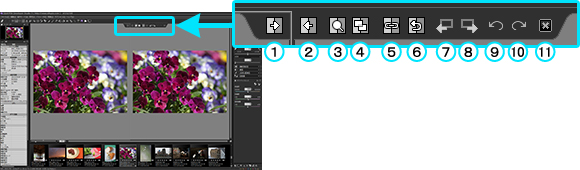 Selected images for adjusting development parameters are displayed on both displays. 3.2.1.1. Operation Methods You can set options such as display position and magnification for the two images, so you can view one overall image and use the other screen to display partial magnification. You can also display two important parts of the photograph and decide how to adjust parameters. Switch to multi preview by clicking on the 3.2.1.2. Selecting Reference Preview Images icon in the toolbar.The status of the multi preview display is shown at the top of the screen in the icon bar as seen in this figure. You can change modes and preview displays with these icons. ![]()