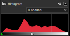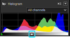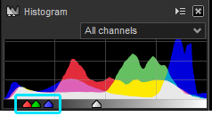 This feature gives a warning for the portion where the color is outside of the color gamut. It means that the saturation in this portion is to high.Please refer to '10.1.6. Color Gamut and Adjustment Outside of Color Gamut'. 6.2. Histogram The menu command [View (V)]-[Histogram (H)] displays the "Histogram" sub-control. Histogram displays a brightness distribution on a picture.You can check which part of the picture has what level of brightness. The horizontal axis shows brightness (0-255), and the higher the value (right side), the greater the brightness. The vertical axis shows the number of pixels that corresponds to relevant brightness level. R,G, and B are displayed in each color on a graph, and the place where these overlap it is displayed as an additive color mixture. 6.2.1. Display of Histogram The arrow displayed on the gray scale at the bottom has the following meaning.