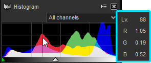 This displays RGB value at the point where the mouse cursor is on. The value corresponds to the brightness position on a graph.It is very effective to check where a color of a point on a screen is distributed on a histogram.