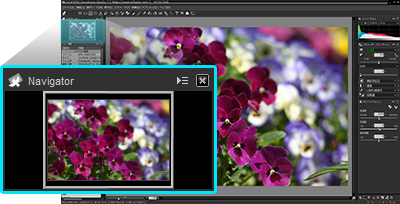 You can display the histogram of any channel of RGB. In addition, by clicking a graph, you can see each brightness statistic of the RGB.Lv is the value given to brightness (0-255) shown on the horizontal axis. "R", "G" and "B" are the statistical values for RGB in percentage (%) units. If the histogram of the image is evenly distributed for each RGB value (Lv value), the value for each statistical value 0-255 will be 1/256 = 0.39%. For normal photographs, most of the area will be in the range of 0.00-2.00, but brightness distribution may be consolidated in a photograph whose subject is almost a single color, such as completely dark photographs and macro shots of flowers. 6.3. Navigator The "Navigator" is a guide display for places displayed on the preview screen for the dedicated thumbnail.You can change the position of the display by dragging the guide on the "Navigator" in tool modes other than Fitted display, such as Zoom tool, Loupe tool or Palm tool. In addition, you can expand or shrink the preview with mouse wheel operations on the "Navigator". The Navigator is not displayed when in thumbnail mode because this is effective only when in the preview window is displayed. 6.4. Shortcut Keys and Function Keys Shortcut keys and Function keys that you can use in SILKYPIX® Developer Studio 7 are shown below.