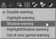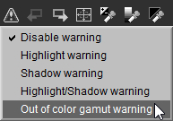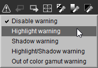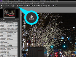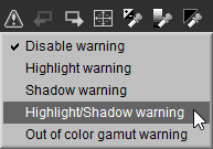6.1. Highlights, Shadows and Out of Color Gamut Warning This software has warning functions to support parameter adjustment. When you click the button on the toolbar, you can enable each warning.In addition, if there is a check at [View (V)]-[Display warning]-[Flash warning] in the menu, warning displays will flash on the image in the preview display. If there is no check the warning display is always displayed.