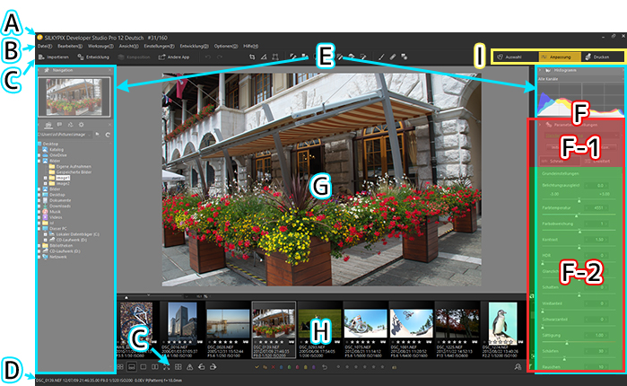 Das SILKYPIX-Fenster ist aus den folgenden Bereichen aufgebaut: