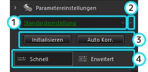 Bei den Haupteinstellungen lassen sich vorgegebene Einstellungen (Vorlieben) für jede Entwicklungseinstellung auswählen. Weiterhin lassen sich die Entwicklungseinstellungen detailliert anpassen.(F-2) Kontrollbereich