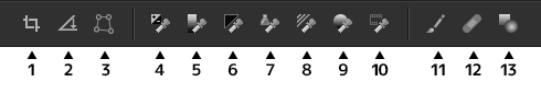 Ruft das Ausbesserungswerkzeug auf, mit dem Sie kleine Fehler im Bild korrigieren können.Retuschierpinsel-Werkzeug