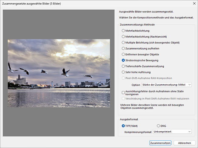 Darüber hinaus gibt es eine Funktion “Ausgewählte Bilder zusammensetzen”, die Bilder aus Mehrfachauswahlen zusammensetzt und als eine einzige DNG- oder TIFF-Bilddatei speichert.