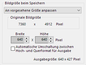Zu beachten ist, dass SILKYPIX Ihnen nur solche Größen anbietet, die dem Seitenverhältnis des zu speichernden Bildes entsprechen.
