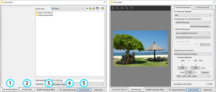 Im Dialog Entwickeln und Speichern legen Sie unter anderem Speicherverzeichnis, Dateiname und Bildgröße fest und können Grund- als auch erweiterte Einstellungen vornehmen (beachten Sie die Reiter im Dialogfenster), die echtzeitparallel im Vorschaufenster angezeigt werden.