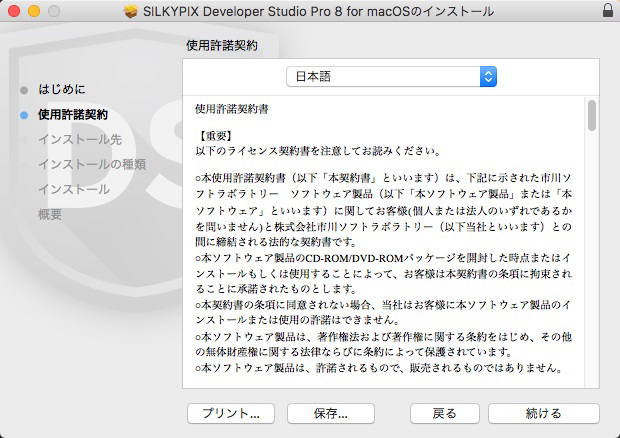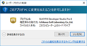 1.1. ソフトウェアのインストールと起動 セットアッププログラム(Windows版)を実行すると、本ソフトウェアのインストールが開始されます。インストールが完了すると、デスクトップに"SILKYPIX® Developer Studio Pro8"または"SILKYPIX® Developer Studio 8"のアイコンが作成されます。 ![]() インストールおよび"SILKYPIX® Developer Studio Pro8 / SILKYPIX® Developer Studio 8"の初回起動時にはご使用のPCに管理情報を記録するために管理者として処理をおこないます。 続行するにはあなたの許可が必要となります。「ユーザーアカウント制御」のダイアログが表示されますので、以下のいずれかで処理を続行してください。 あなたのアカウントが標準ユーザーの場合(管理者ではない場合)、管理者アカウントのパスワードを入力して[はい]ボタンをクリックしてください。 あなたのアカウントが管理者の場合は[はい]をクリックしてください。初回起動時の処理は管理者としておこないますが、これらの処理が完了すると"SILKYPIX® Developer Studio Pro8 / SILKYPIX® Developer Studio 8"は標準ユーザーとして動作します。 Windowsでの動作については、「1.3. Windowsでの動作」を参照してください。 インストール完了後に、「プログラム互換性アシスタント」のダイアログが表示される場合があります。 その場合は「1.3.3. プログラム互換性アシスタント」の指示に従って対処してください。 1.1.2. macOS版のセットアップと起動 「dmg」ファイルをダブルクリックして実行すると、デスクトップに「SILKYPIX~」というボリュームで表示(マウント)され、ウィンドウが開きます(開かない場合は、デスクトップに表示されたボリュームをダブルクリックしてください)。開かれたウィンドウの中にある、「SILKYPIX® Developer Studio Pro8 インストーラ」または「SILKYPIX® Developer Studio 8 インストーラ」アイコンをダブルクリックして起動すると、本ソフトウェアのインストールが開始されますので、指示に従ってお進み下さい。 ![]() インストール後、「アプリケーション」フォルダにあるSILKYPIXアイコンをダブルクリックして起動します。 初回起動時に管理者パスワードが要求されることがあります。 アンインストールをおこなう際は、「アプリケーション」フォルダの「SILKYPIX」アイコンをゴミ箱に移動してください。