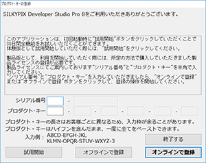 1.2. 試用とプロダクト・キーの登録 本ソフトウェアをご利用いただくためには、ライセンスをご購入いただき、ライセンスを登録していただく必要がございます。 また、購入前に機能や画質などをお試しいただくために、一定期間の試用をおこなうことが可能です。 1.2.1. 試用の開始 本ソフトウェアは、購入前に機能や画質などをお試しいただくために、一定期間の試用をおこなうことが可能です。 1.2.2. プロダクト・キーの登録 ソフトウェアを起動すると、「プロダクト・キーの登録」ダイアログが表示されますので、[試用開始]ボタンをクリックしてください。 あらかじめ定められた期間が経過すると本ソフトウェアは使用できなくなりますので、それまでの間に是非ご購入いただきますようお願い申し上げます。 インストールおよび"SILKYPIX® Developer Studio Pro8 / SILKYPIX® Developer Studio 8"の初回起動時にはご使用のPCに管理情報を記録するために管理者として処理をおこないます。 続行するにはあなたの許可が必要となります。「ユーザーアカウント制御」のダイアログが表示されますので、以下のいずれかで処理を続行してください。 あなたのアカウントが標準ユーザーの場合(管理者ではない場合)、管理者アカウントのパスワードを入力して[はい]ボタンをクリックしてください。 あなたのアカウントが管理者の場合は[はい]をクリックしてください。初回起動時の処理は管理者としておこないますが、これらの処理が完了すると"SILKYPIX® Developer Studio Pro8 / SILKYPIX® Developer Studio 8"は標準ユーザーとして動作します。 Windowsでの動作については、「1.3. Windowsでの動作」を参照してください。 "SILKYPIX® Developer Studio Pro8 / SILKYPIX® Developer Studio 8"のライセンスを登録していただくことで、永続的に本ソフトウェアをご使用いただけるようになります。プロダクト・キーの登録には2つの方法があります。インターネット経由でサーバーに接続して自動的登録をおこなう「オンライン登録」と、インターネットに接続されていないPCでも登録可能な「オフライン登録」です。 ご使用になるPCにプロダクト・キーの登録をおこなった後で、PCの買い替えなどにより本ソフトウェアをご使用になるPCの変更をおこないたい場合、登録されたPCから「プロダクト・キー登録の解除」をおこなっていただくことによって、他のPCにライセンスを移行することができます。 詳しくは、「1.2.3. プロダクト・キー登録の解除」を参照してください。 OSの再インストールなどをおこなった場合には、再度シリアル番号とプロダクト・キーの入力と登録が必要となりますのでシリアル番号とプロダクト・キーは大切に保管してください。 原則として、ライセンスの再発行はおこなっておりません。管理には十分ご注意ください。 ひとつのプロダクト・キーで登録できるPCの台数は3台となります。4台以上のPCでご利用になる場合は、別途ライセンスをお求めください。 インストールおよび"SILKYPIX® Developer Studio Pro8 / SILKYPIX® Developer Studio 8"の初回起動時にはご使用のPCに管理情報を記録するために管理者として処理をおこないます。 続行するにはあなたの許可が必要となります。「ユーザーアカウント制御」のダイアログが表示されますので、以下のいずれかで処理を続行してください。 あなたのアカウントが標準ユーザーの場合(管理者ではない場合)、管理者アカウントのパスワードを入力して[はい]ボタンをクリックしてください。 あなたのアカウントが管理者の場合は[はい]をクリックしてください。初回起動時の処理は管理者としておこないますが、これらの処理が完了すると"SILKYPIX® Developer Studio Pro8 / SILKYPIX® Developer Studio 8"は標準ユーザーとして動作します。 Windowsでの動作については、「1.3. Windowsでの動作」を参照してください。 1.2.2.1. プロダクト・キーのオンライン登録 インターネットに接続されたPCでご利用の場合、インターネット経由でサーバーに接続することで自動的にプロダクト・キーの登録がおこなえます。 1.2.2.2. プロダクト・キーのオフライン登録 ひとつのプロダクト・キーで登録できるPCの台数はプロダクト・キーの種類によって異なります。また、何らかの障害で再登録が必要な場合は、同一のPCであればそのまま再登録をおこなうことができます。 再登録がおこなえない場合につきましては、「1.2.4. プロダクト・キーの登録に関する問い合わせ」をご参照の上、弊社サポートまでお問い合わせください。 4台以上のPCでご利用になる場合は、別途ライセンスをお求めください。 「プロダクト・キーの登録」ダイアログでシリアル番号とプロダクト・キーを入力していただき、「プロダクト・キーを登録」のボタンをクリックしてください。 入力いただいたシリアル番号とプロダクト・キーは、登録処理(レジストレーション)をおこなうために弊社サーバーへ問い合わせをおこないます。この時通信がおこなわれますので、必ずインターネット