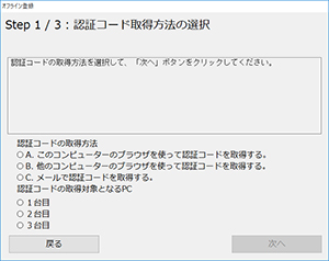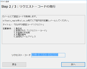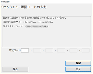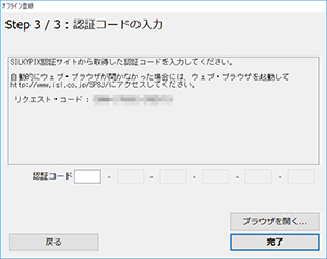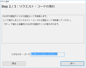 この方式は、セキュリティソフトやプロキシなどネットワーク環境の都合上オンライン登録ができない方のために用意された方法です。SILKYPIX®をインストールされましたPCがインターネットを経由して、SILKYPIX認証サイトをブラウザで表示できる場合にご利用になれます。 Step-1「A. このコンピューターのブラウザを使って認証コードを取得する。」を選択し、「次へ」ボタンを押してください。 「認証コードの取得対象となるPC」で何台目として登録するかを選択してください。 Step-2「認証コード」を取得するための「リクエスト・コード」が表示されます。Step-3で自動的にブラウザが起動され、SILKYPIX認証サイトが表示されますので、Webに表示される手順に従って「認証コード」を取得してください。 ダイアログの「次へ」ボタンを押してください。 Step-3SILKYPIX認証サイトで取得した「認証コード」を入力してください。 ダイアログの「完了」ボタンを押してください。これでプロダクト・キーのオフライン登録は完了です。