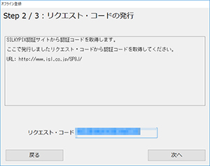 この方式は、SILKYPIX®をインストールしたPCがインターネットに接続できない場合で、近くにインターネット接続可能なPCがあって、SILKYPIX認証サイトをブラウザで表示できる場合にご利用になれます。 Step-1「B. 他のコンピューターのブラウザを使って認証コードを取得する。」を選択し、「次へ」ボタンを押してください。 「認証コードの取得対象となるPC」で何台目として登録するかを選択してください。 Step-2「認証コード」を取得するための「リクエスト・コード」が表示されます。 インターネットに接続している他のPCのブラウザで、SILKYPIX認証サイトを表示してください。 SILKYPIX認証サイトが表示されましたら、Webに表示される手順に従って「認証コード」を取得してください。 ダイアログの「次へ」ボタンを押してください。 SILKYPIX® Developer Studio Pro8 認証サイト http://www.isl.co.jp/SP8J/ SILKYPIX® Developer Studio 8 認証サイト http://www.isl.co.jp/S8J/ Step-3SILKYPIX認証サイトで取得した「認証コード」を入力してください。 ダイアログの「完了」ボタンを押してください。これでプロダクト・キーのオフライン登録は完了です。