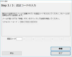 メールの本文: 1. 製品名 2. 取得された「リクエスト・コード」 3. お客様のお名前 4. お電話番号 5. 返信先メールアドレス (6. 再登録の場合「再登録が必要となった理由」) Step-3弊社からの返信メールを受け取るまでの間、オフライン登録の作業は一時保留していただきます。「保留」ボタンを押すと、オフライン登録はいったん終了します。 弊社からの返信メールを受け取りましたらSILKYPIX® Developer Studio Pro8 / SILKYPIX® Developer Studio 8を起動し、メニューの[ヘルプ]-「プロダクト・キーの登録」を選択してください。オフライン登録の続きが始まります。 弊社からの返信メールに記載されている「認証コード」を入力してください。 ダイアログの「完了」ボタンを押してください。これでプロダクト・キーのオフライン登録は完了です。