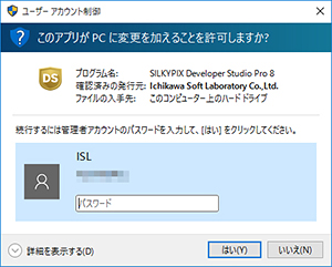 本ソフトウェアでは、プロダクト・キーの登録、再登録、他のPCへの移行について、インターネットを経由して、お客様ご自身で自動的におこなう方法を提供しております。 弊社にお問い合わせいただく前に、これらの方法を活用して、お客様ご自身で問題点を解決することができないかどうか、いま一度ご確認いただけますようお願い申し上げます。 問題点の解決方法について、弊社ホームページ(http://www.silkypix.com)に情報が掲載されている場合がございます。 ユーザーサポートの「FAQ(よくあるご質問)」をご活用ください。 それでも、お客様ご自身で問題点の解決ができない場合には、メールにて弊社サポートまでお問い合わせください。 (メールアドレス:silkypix_support@isl.co.jp) その際に、できるだけ詳しく障害内容を記載していただくことと、必要事項に漏れがないことをご確認ください。 【メールにご記載いただく必要事項】 ソフトウェア名: "SILKYPIX® Developer Studio Pro8 / SILKYPIX® Developer Studio 8" ソフトウェアのシリアル番号(「12.1. ソフトウェアのバージョンとお客様の登録情報の確認方法」をご参照ください。) お客様のお名前 お電話番号 返信先メールアドレス 障害内容(できるだけ詳しく) 1.3. Windowsでの動作 1.3.1. 管理者として動作する場合について Windows(Windows7 / 8.1 / 10)で"SILKYPIX® Developer Studio Pro8 / SILKYPIX® Developer Studio 8"をご使用の場合、初回起動時、試用の開始、ならびにプロダクト・キーの登録や登録の削除をおこなう場合、ご使用のPCに管理情報を記録するために管理者として処理をおこないます。 1.3.2. Windowsで使用する場合の注意 続行するにはあなたの許可が必要となります。「ユーザーアカウント制御」のダイアログが表示されますので、以下のいずれかで処理を続行してください。 あなたのアカウントが標準ユーザーの場合(管理者ではない場合)、管理者アカウントのパスワードを入力して[はい]ボタンをクリックしてください。 あなたのアカウントが管理者の場合は[はい]をクリックしてください。管理者として処理がおこなわれるのは、初回起動時、試用の開始、ならびにプロダクト・キーの登録や登録の削除をおこなう場合のみです。そして、これらの処理が完了すると"SILKYPIX® Developer Studio Pro8 / SILKYPIX® Developer Studio 8"は標準ユーザーとして動作します。 Windowsでは、実行ファイル(.EXE)やショートカットに管理者として実行させる属性を付けたり、コンテキスト・メニューの「管理者として実行」を選択することにより本ソフトウェアを明示的に管理者として実行することができます。 しかしながら、このような方法で管理者として動作した場合、標準ユーザーで動作している他のソフトウェアとの通信ができないなどの障害が発生する場合があります。本ソフトウェアは必ず標準ユーザーとして起動してください。 本ソフトウェアは、初回起動時、試用の開始、ならびにプロダクト・キーの登録をおこなう場合に、ご使用のPCに管理情報を記録するために管理者として処理をおこないます。 管理者としての処理は自動的に誘導されますが、続行するにはあなたの許可が必要となります。「1.3.1. 管理者として動作する場合について」の内容に従って処理を続行してください。 | |||||||||||||||||||||||||||||||||||||||||||||||||||||||||||||||||||||||||||||||||||||||||||||||||||||||||||||||||||||||||||||||||||||||||||||||||||||||||||||