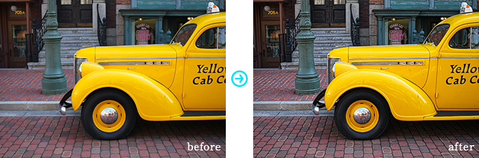 4.11.2.2. 中央/周辺重視 歪みの補正を中央部を重視しておこなうか、周辺部を重視しておこなうかを決定します。 画像の端にあるまっすぐな線は適切に補正されているのに、画像中心付近は補正が強すぎる場合には、「周辺重視」側にスライダーを調整します。逆に、画像中心付近の補正が弱すぎる場合には、「中央」側にスライダーを調整します。次の例は、レンズの歪曲収差の影響を受けて、柱が曲がっている例が左の図です。この画像に補正をおこない、歪んだ柱をまっすぐにした例が右の図になります。