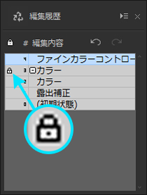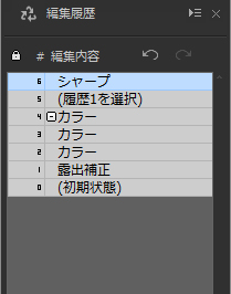 4.19.1. 「編集履歴」サブコントロール 「編集履歴」サブコントロールは、メニューの[表示(V)]-[編集履歴]、または「パラメータ・コントロール」の から起動します。処理対象の代表コマに対しておこなった現像パラメータの編集や履歴に対する操作は、編集内容として「編集履歴」サブコントロールに表示します。 操作の内容は、「露出補正」や「カラー」などのように、見やすく整理されて、カテゴリごとにまとめられます。 編集内容は1コマあたり30履歴まで保存します。それ以上に編集内容が増えた場合は、古い編集内容は削除され、最近の30履歴を保持します。 4.19.1.1. 操作方法