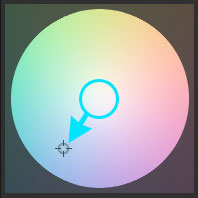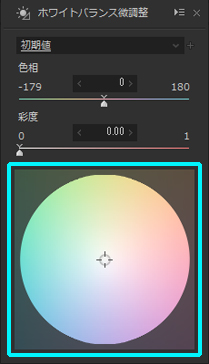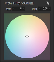 ホワイトバランスターゲットとは、正確な色空間からマッピングして作成した指定領域で、 直接マウスでクリックすることで直感的にホワイトバランスの設定をおこなうことができます。 【マウスホイールでの操作】ホワイトバランスターゲット上にマウスカーソルをのせた状態でマウスホイールを動かすと、彩度スライダーを操作できます。 [Shift]キーを押しながらマウスホイールを動かすと、色相スライダーを操作できます。