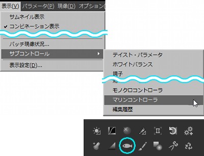 「10.0」から「100.0」まで、スライダーで調整します。「100.0」の方向へ調整することにより、より濃い色のフィルタを装着した状態となります。 4.15.2. 明度 それぞれの色相の明度を、「-50.0」から「50.0」まで、スライダーで調整します。 「-50.0」の方向へ調整すると暗く、反対に「50.0」の方向へ調整すると明るく反映します。 色相名 赤 紫 群青色 水色 青緑 緑 黄色 オレンジ モノクロコントローラのカラーフィルタ、または明度を有効にすると、操作が可能となります。 この項目がチェックマークの付いた有効な状態で、モノクロコントローラを操作すると、操作を開始した直後から、画像をモノクロ化して、画像に処理を反映します。 カラーフィルタで色相を選択してから、この項目が無効な状態で、モノクロコントローラを操作すると、選択している色相を画像に反映して処理をおこなうことができます。 また、カラーフィルタを選択せず、この項目が無効な状態で、モノクロコントローラを操作すると、画像をモノクロ化しないまま、画像に処理を反映します。 4.16. マリンコントローラ マリンコントローラでは、水中写真専用のホワイトバランスや水中で失われる色を復元する色復元など、水中写真に特化した調整をすることができます。 メニューから、[表示(V)]-[サブコントロール]-[マリンコントローラ]を選択すると、マリンコントローラが表示されます。 また、パラメータ・コントロールの下部にあるサブコントロール・アイコンから選択できるサブコントロール・アイコンの アイコンからも表示できます。4.16.1. 水中オートホワイトバランス ![]() ボタンを押すと、画像を解析して水中写真の青みを取り除く方向でホワイトバランスを自動的に決定し、ホワイトバランスサブコントロールの色温度と色偏差、および色深度と水中色偏差を設定します。![]() 水中グレーバランスツールは、写真の中のグレー(無彩色)に表現したい部分を指定して、その部分がグレーに表現されるように、自動的にホワイトバランスを調整し、色深度と水中色偏差が計算されます。 ボタンをクリックすると、水中グレーバランスツールによるホワイトバランス調整モードに入ります。特に、写真の中に白いものが(あるいは色のない無彩色のものが)写っている場合に非常に有効な方法です。 完全な白でなくても、砂地などをクリックして、大まかにホワイトバランスを取ってから、色深度と水中色偏差を使って追い込むこともできます。 ![]() 色深度では、水深に対応したホワイトバランスの調整をおこないます。 「0」から「3000」まで、スライダーで調整します。 数値が大きくなるほど青みが少なくなり、赤味が強調されます。 水中色偏差では、水の色によって、緑がかったり、青みがかったりした画像を調整します。「緑 (-100)」から「青 (100)」まで、スライダーで調整します。 透視透明度の高い青い海で撮影した場合には、画像の青みが強くなります。 この場合には、水中色偏差を緑側に調整することでホワイトバランスを取ることができます。 また、濁った海の場合、画像が緑がかります。 この場合には、水中色偏差を青側に調整することで、ホワイトバランスを取ることができます。 色復元では、水中で失われる赤や、それに伴って変化する色を復元する量を調整します。「0」から「200」まで、スライダーで調整します。 「0」にすると、色復元の処理がまったくおこなわれなくなります。 これは、ホワイトバランスだけが取られた状態で、概ねダイバーが実際に知覚した色に近い色再現となります。 「100」にすると、プログラムが算出した色復元の量が100%適用され、水中にあるものや魚などを水面で観測した場合の色のように復元しようとします。 水中の濁りによる光の散乱を除去する機能です。「0」から「100」まで、スライダーで調整します。 濁り除去の量を大きくすると、画像は暗くなります。 これは、濁りによって散乱した光が取り除かれるためです。 画像が暗くなりすぎる場合には、本機能と合わせて、露出補正を使って明るさを整えてください。 4.17. スポッティングツール スポッティングツールは、写真に写りこんだゴミなどを消去したり、赤目を補正するためのツールです。 デジタルカメラのイメージセンサーに付着したゴミが写真に写りこんだ場合や、フィルムスキャナーで取り込んだ画像に写りこんだゴミなどを消去したり、ストロボにより赤目になってしまった場合に補正することを主な目的としています。 スポッティングツールを使うには、プレビュー表示が表示されている状態で、メニューの[操作モード(M)]-[スポッティングツール]を選択するか、サブコントロール・アイコンの から「スポッティングツール」モードに切り替えてください。「スポッティングツール」モードに切り替わると、「スポッティングツール」サブコントロールが表示されます。 また、プレビュー表示上には「スポッティン