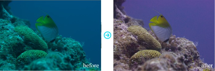 水中グレーバランスツールは、写真の中のグレー(無彩色)に表現したい部分を指定して、その部分がグレーに表現されるように、自動的にホワイトバランスを調整し、色深度と水中色偏差が計算されます。 4.4.7. 暗部調整 メニューから、[操作モード(M)]-[水中グレーバランスツール]を選択するか、マリンコントローラの中の ボタンをクリックすると、水中グレーバランスツールによるホワイトバランス調整モードに入ります。この状態で、プレビュー画像上のグレーにしたい部分をクリック、もしくは、ドラッグして範囲を指定すると、その部分をグレーとして再現するようなホワイトバランスが設定されます。 特に、写真の中に白いものが(あるいは色のない無彩色のものが)写っている場合に非常に有効な方法です。完全な白でなくても、砂地などをクリックして、大まかにホワイトバランスを取ってから、色深度と水中色偏差を使って追い込むこともできます。