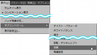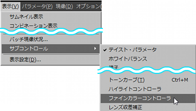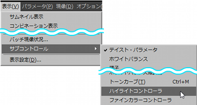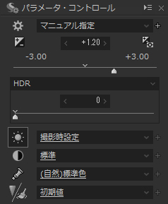 このモードによってSILKYPIXで現像処理したJPEG/TIFF画像を選択した場合、現像結果に埋め込まれている現像パラメータを閲覧することができます。 ここで表示される現像パラメータは、その画像が現像処理される際に設定されたものです。 この現像パラメータは、ペーストバッファや一時登録にコピーして、他のJPEG/TIFF画像に適用することができます。 現像パラメータが埋め込まれない設定で記録保存されたJPEG/TIFF画像や、SILKYPIX以外で記録保存されたJPEG/TIFF画像の場合には、現像パラメータは表示されません。 選択したコマに現像予約を設定します。 現像予約を設定すると、メニューの[現像(D)]-[現像予約コマのバッチ現像(V)]から複数のコマを一括で現像することができます。「3.4.1. 予約・マーク」の現像予約と同じものです。 4.8.6. 1コマ現像 4.9. ハイライトコントローラ ハイライトコントローラは、ハイライト領域の色づくりをコントロールする機能です。 メニューから[表示(V)]-[サブコントロール]-[ハイライトコントローラ]を選択してください。「ハイライトコントローラ」サブコントロールが表示されます。右下にあるサブコントロール・アイコンのハイライトコントローラボタンでも表示できます。 「ハイライト領域」とは、RGB のいずれかの要素が飽和している領域を指しています。オーバー露出で撮影された場合に多く発生しますが、適正露出で撮影された場合でも、極めて彩度の高い被写体が写っている場合や、発光体/反射体などが写っている場合に発生します。 これらの「ハイライト領域」は色情報が正しくは記録されていませんので、これらの領域の色再現はSILKYPIX現像エンジンが予測しておこないます。 「色彩重視/輝度重視」と「彩度重視/色相重視」の2つのパラメータは、「ハイライト領域」の色再現の方針を指示するものです。 「明部補償」は、「ハイライト領域」の明度を復元する機能です。 真っ白に飛んでしまった領域に階調を復元させることができます。 ![]()