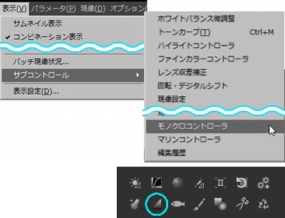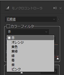 カメラで設定した縦横比(アスペクト)をトリミング領域の初期状態として利用します。 本機能は一部の対応カメラでのみ有効となります。未対応のカメラでは設定した縦横比(アスペクト比)は無視され、カメラの初期設定の縦横比(アスペクト)で表示されます。なお、現像処理の対象領域はご利用のカメラの初期設定の縦横比(アスペクト)で撮影された場合の領域になります。 4.15. モノクロコントローラ モノクロコントローラでは、指定したカラーフィルタをレンズに装着したような効果をシミュレートする「カラーフィルタ」と、特定の色相の明度を調整する「明度」の2種類の設定を使って、画像をモノクロ化する際の調整をおこなうことができます。 メニューから、[表示(V)]-[サブコントロール]-[モノクロコントローラ]を選択すると、モノクロコントローラが表示されます。 右下にあるサブコントロール・アイコンの アイコンからも表示できます。なお、テイストのドロップダウンリストを「初期値」にすると、モノクロコントローラで操作を開始する直前の状態に戻すことができます。 4.15.1. カラーフィルタ カラーフィルタでは、プルダウンリストから選択された色のフィルタをカメラに装着した際の状況をシミュレートします。 はじめに、プルダウンリストでフィルタの色相名を以下の8色から選択します。選択したフィルタに対して、「色相」・「濃度」で調整します。 色相名 赤 オレンジ 黄色 黄緑 緑 青 紫 ピンク