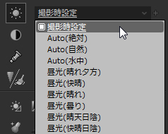 4.1.1.2. その他のテイスト 「全カテゴリ・テイスト」を除くその他のテイストのドロップダウンリストについて説明いたします。 これらのテイストのドロップダウンリストは、メイン・コントロールと、各サブコントロールの最上部に配置されています。 メイン・コントロール部に配置された「全カテゴリ・テイスト」を除くドロップダウンリストは、上から順に 「ホワイトバランス・テイスト」 です。 これらのドロップダウンリストは、「ホワイトバランス」、「調子」、「カラー」、「シャープ」、「ノイズリダクション」のサブコントロールがフローティング・ウィンドウとして表示される際に、各サブコントロールの最上部に配置されるドロップダウンリストと共通のものです。「調子・テイスト」 「カラー・テイスト」 「シャープ・ノイズリダクション・テイスト」