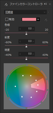 4.10. ファインカラーコントローラ ファインカラーコントローラは、色を自由に操ることができる強力な色調整機能です。 メニューから、[表示(V)]-[サブコントロール]-[ファインカラーコントローラ]を選択すると、「ファインカラーコントローラ」サブコントロールが表示されます。 パラメータ・コントロールの下部にあるサブコントロール・アイコンのファインカラーコントローラ・アイコンからも表示できます。 ![]() ファインカラーコントローラは色を8つの色相に分けて、それぞれの色相ごとに色を調整する機能を提供します。 コントロール上に表示されているカラーサークルの色相表示は色度図を白点中心に配置したもので、色は時計の3時の位置から時計回りに以下のように配置されています。
