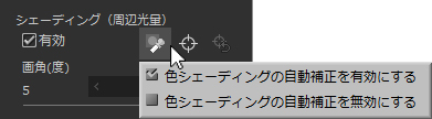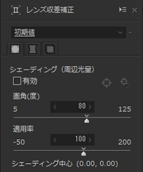 4.11. レンズ収差補正 レンズ収差補正は、現像時にレンズの収差を補正することで、より高品位な画像を生成するための機能です。 メニューから、[表示(V)]-[サブコントロール]-[レンズ収差補正]を選択してください。「レンズ収差補正」サブコントロールが表示されます。右下にあるサブコントロール・アイコンの からも表示できます。![]() カメラのレンズには収差が存在し、デジタルカメラの解像度が向上した今日では、その収差が写真に大きな悪影響を及ぼす場合もあります。 レンズ収差には、球面収差、コマ収差、非点収差、像面湾曲、ディストーション(歪曲収差)、軸上色収差、倍率色収差や、周辺に行くほど光量が低下する周辺光量低下があります。 これらの収差に対し、SILKYPIX®は 「シェーディング(周辺光量)」、「ディストーション」、「倍率色収差」の3つの補正機能を提供します。 ![]() 「レンズ収差補正」サブコントロールには、上記の3つの補正機能に対応したタブが表示されています。 各パラメータを調整する際は、シェーディング(周辺光量) 4.11.1. シェーディング(周辺光量) シェーディング 4.11.2. ディストーション 4.11.1.1. 画角(度) 撮影時のレンズの対角線画角を入力します。 この画角から、レンズ設計理論上の周辺光量低下を計算して補正をおこないます。レンズは、周辺にいくほど光量が低下する性質を持っています。この周辺光量低下は、画角の大きい広角レンズほど大きく、画角の小さい望遠レンズほど小さくなります。 35mmフィルム換算(フルサイズデジタル一眼)で、50mm の標準レンズの画角は約46度、135mm 望遠レンズでは約18度、35mm 広角レンズでは約63度となります。 ただし、必ずしも実際の撮影時の周辺光量低下とは一致しない場合がありますので、先の数値を参考にスライダーを動かして中心と周辺の明るさがバランスする点を見つけてください。 補正量を適用する割合を入力します。 4.11.1.3. シェーディング中心ツール 0%にするとまったく補正しなくなり、100%にすると画角から算出された理論値が使用されます。パラメータは200%まで指定可能です。 周辺光量の低下も一種のレンズの味ですから、完全に補正せず周辺光量の低下を若干残しておきたい場合や、周辺に明るいものが写っていて補正してしまうと飛んでしまう場合などに、補正の適用量を加減することができて便利です。 また、マイナスの値を設定すると、逆に周辺光量低下を強めることができます。わざと周辺部分を暗くして中心部分を目立たせたい場合や、背景を整理したい場合などに活用してください。 [有効]にチェックが入っている状態で 4.11.1.4. 周辺光量低下について 円の中心部の十字が交差する位置がシェーディング効果の中心位置を示しており、この部分をドラッグすることでシェーディング(周辺光量)を補正する中心を変更することができます。 これは、写真をトリミングし画角中心がずれた場合でも、効果としてあえて四隅均等に減光効果を得る場合などに役立ちます。 なお、 シェーディング効果の中心位置は、画像の中心を(0, 0)とし、トリミング領域設定で拡張した領域の端を基準とした各辺の長さを1とした座標で表現されています。そのため、拡張領域の左上隅が(-0.5, -0.5)、右上隅が(0.5, -0.5)、右下隅が(0.5, 0.5)というようになります。 また、シェーディング中心がプレビュー表示の範囲外にある場合は、コントロールの表示がピンク色に変化し、中心方向を示す矢印が表示されます。 周辺光量の低下は、いくつかの複合要因によって起こります。 像が歪んで結像される場合には、被写体が小さなるように歪められるほど明るくなり、大きくなるように歪められるほど暗くなります。 例えば、魚眼レンズは、周辺にいくほど被写体を小さく歪めることで周辺の光量の低下を防いでいます。 逆に、広角レンズの場合は一般に直線が直線として写るように歪曲収差補正が施されていますが、周辺部を拡大するという方法で補正するために、画像の周辺部は暗くなります。 また、レンズによっては、斜めから見るとレンズの口径が見かけ上減少する場合があり(ビグネッティング)、実際の画角の理論特性よりも周辺でより多くの光量低下を引き起こす場合があります。 絞り値によっても周辺光量の落ち込みが変化します。開放では大きく落ち込み、絞ると落ち込みが少なくなるという現象です。 さらに、デジタルカメラ特有の現象として、イメージセンサーへの光の斜入射によっても周辺光量低下が発生します。 このため、画角はあくまでも参考値です。バランス良く補正される点を探してください。 画角パラメータを小さくすると、補正量も小さくなりかつ中心と周辺の補正がリニアになります。大きくすると補正量が大きくなり、周辺に行くほどさらに補正量が大きくなります。 例えば、画像の中心部はだいたい良く補正されているのに、画像の隅の方だけ暗くなるような場合には、画角パラメータを大きくして