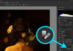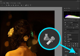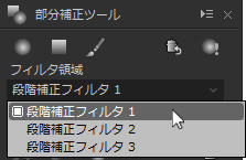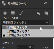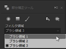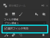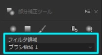 b. フィルタの全削除 をクリックすると、「フィルタ領域」に追加されている全ての項目を削除します。c. 部分補正フィルタの強調表示 「部分補正ツール」で画像に修正を加えた領域を強調表示します。 をクリックすることで、強調表示のON/OFFを切り替えます。 d. フィルタ領域 指定した「円形補正フィルタ」、「段階補正フィルタ」、「ブラシ領域」を管理します。 ここで選択されているフィルタが、その時操作できる領域となります。 e. 選択フィルタ有効 「フィルタ領域」で選択されているフィルタの効果を有効にします。 チェックを外すと、設定されている効果が無効になります。 f. 選択フィルタへのブラシの追加 をクリックすると、「フィルタ領域」で選択されているブラシ領域に対する編集モードとなり、ブラシを追加して描くことができます(※1)。g. ブラシ消しゴム をクリックすると、「フィルタ領域」で選択されているブラシ領域に対する編集モードとなり、描かれているブラシを消すことができます(※1)。h. 選択フィルタの複製 をクリックすると、「フィルタ領域」で選択されているフィルタを複製します。複製元のフィルタ中央から右下に少しずれた場所に、フィルタサイズと各パラメータが保持された状態でフィルタが複製されます。 i. 選択フィルタの削除 をクリックすると、その時「フィルタ領域」で選択されているフィルタのみ削除します。