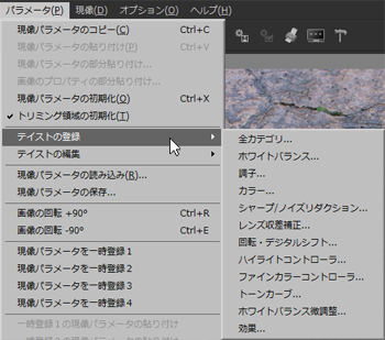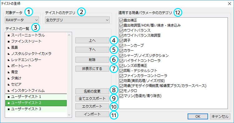 「テイストのカテゴリ」が「全カテゴリ」以外のテイストとして追加される場合には、「適用する現像パラメータのカテゴリ」は1つのカテゴリに固定されていますので編集する必要はありません。 「テイストのカテゴリ」が「全カテゴリ」の場合は、「適用する現像パラメータのカテゴリ」でどのカテゴリを有効にするか設定することができます。 有効に設定されたカテゴリがテイストのマスクとして設定されます。 登録されているテイストの編集をおこなうことができます。 テイストの名称を変更したり、表示順序を変更したりすることにより、テイストの選択がしやすいようにカスタマイズすることができます。 また、エクスポート、インポートの機能により、テイストを保存・復元することや、他のPCにテイストを移行することができます。 「テイストの編集」は、メニューの[パラメータ(P)]-[テイストの編集]-[パラメータ系テイストの編集]からおこないます。 ![]()