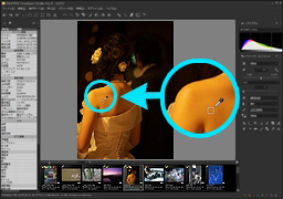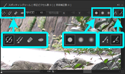 [Alt]キーを押した状態では、「スポッティングツール」のプレビュー画像の表示位置・倍率の変更を「ズームツール」でおこなえます。 「スポッティングツール」を使用する場合は、プレビュー・ウィンドウの表示も工夫することで、効率良く作業を進めることができます。[Alt]キー+ドラッグで、表示位置の移動がおこなえ、[Alt]キー+[Shift]キー+ドラッグで表示の拡縮ができます。 「スポッティングツール」を使用してゴミを消去したり、赤目補正をおこなったデータは、現像パラメータとして保存されます。 このデータ量は「スポッティングツール」での修正量に応じて変化しますが、10KB~1MB以上と他のデータと比較するとかなり大きなデータサイズとなりますことをご留意ください。 「スポッティングツール」での修正データは、「現像パラメータの貼り付け」では適用されません。 「現像パラメータの部分貼り付け」の機能を使って、明示的に「スポッティングツール」のカテゴリを指定してください。 自動的に保存される現像パラメータや、「現像パラメータの保存」で明示的に保存される現像パラメータには「スポッティングツール」のデータは記録保存されますが、JPEG/TIFFのEXIF情報として埋め込まれる現像パラメータには記録保存されません。 4.18. 部分補正ツール 部分補正ツールは、補正したい領域を指定し、その領域内の明暗やコントラストなどを部分的に補正するためのツールです。 逆光で暗くなってしまった人物の表情の明るさを持ち上げたり、光の反射で明るく映りすぎた対象物の一部のホワイトバランスを微調整する場合など、画像の一部に補正することを主な目的としています。 部分補正ツールを使うには、プレビューが表示されている状態で、メニューの[操作モード(M)]-[部分補正ツール]を選択するか、サブコントロール・アイコンの ボタンから「部分補正ツール」モードに切り替えてください。「部分補正ツール」モードに切り替わると、「部分補正ツール」サブコントロールが表示されます。