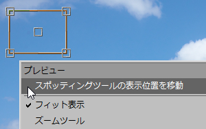 選択コマのプレビュー画像が表示されているプレビュー・ウィンドウ上には、「スポッティングツール」の表示領域を示すナビゲーション表示がおこなわれています。このナビゲーション枠の四隅のハンドルと中央のハンドルを操作することで、表示領域の調整がおこなえます。 また、プレビュー・ウィンドウ上でマウスポインタの位置に「スポッティングツール」の表示領域を移動することができます。 右クリックでコンテキストメニュを表示して、「スポッティングツールの表示位置を移動」を選択してください。