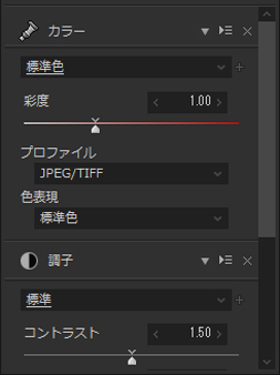 4.6. カラー カラーの調整は、彩度の調整とカラーのプロファイル、カラーの色表現の選択ができます。 4.6.1. テイストからの選択 カラー・テイストに登録されているテイストをドロップダウンリストから選択します。 4.6.2. 彩度の調整 彩度を強くするほど、色が鮮やかになりますが、もともと鮮やかな色があった場合に、色が飽和してディティールが失われることがあります。 彩度を調整する場合には、全体的な色の鮮やかさを見ながら調整するとともに、鮮やかな部分の色が飽和してディティールが失われないかも合わせて気を配る必要があります。 4.6.3. カラーのプロファイル カラーのプロファイルとは、色再現の特性を指します。「カラー」サブコントロールにある「プロファイル」ドロップダウンリストから選択することができます。 カラーのプロファイルには、「V4互換」、「自然」、「忠実」、「モノクロ」、「JPEG/TIFF」、「DNG」、「フォトスタイル/カメラ色」、「フィルム シミュレーション」があります。