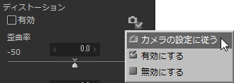 このパラメータ調整と、歪曲率の調整を交互に繰り返すことで、ほとんどの写真レンズの歪みを目立たないところまで追い込むことができます。 このパラメータを適切に追い込めば、いわゆる陣笠タイプと言われる複雑な歪曲収差特性を持つレンズであっても歪曲収差の補正もしくは緩和が可能です。 4.11.2.3. 自動補正 カメラにディストーションの自動補正機能があり、カメラの設定でそのディストーションの自動補正をON/OFFでき、かつ SILKYPIX® Developer Studio Pro8 / SILKYPIX® Developer Studio 8 で対応できる場合、自動補正ボタンが表示されます。この設定により、自動補正を後から変更できます。 ディストーション補正によって、はみ出た領域は自動的にトリミングされ、元の画像サイズと同じサイズになるような拡大がおこなわれます。 トリミング機能の「拡張」機能を使用することで、ディストーション補正によってはみ出た画素を取り出すことができます。「カメラの設定に従う」にした場合、撮影時にカメラ側で設定した値で補正をおこなうかどうかを決めます。 「有効にする」にした場合、撮影時にカメラで設定した値にかかわらず、自動補正を有効にします。 「無効にする」にした場合、撮影時にカメラで設定した値にかかわらず、自動補正を無効にします。 自動補正は、SILKYPIX® Developer Studio Pro8 / SILKYPIX® Developer Studio 8 の「ディストーション」補正の「有効」のチェックの状態にかかわらず、常に設定した値で補正がおこなわれます。 自動補正と SILKYPIX® Developer Studio Pro8 / SILKYPIX® Developer Studio 8 の「ディストーション」補正は別々におこなわれます。どちらも有効にした場合、両方の補正が重ねておこなわれることになります。 「4.14.4. トリミング拡張」もあわせてご参照ください。 ディストーション補正機能は、レンズの歪曲収差を補正する目的で開発されましたが、遠近感を誇張したり、逆に歪曲を強めることによって、広角レンズ周辺の放射状に像が流れる現象を緩和したりと、さまざまな使い方が可能です。 おこなわれる補正は、フォトレタッチソフトなどにある単なる変形機能とは異なり、実際の写真レンズの設計を参考に、レンズで発生する収差特性をシミュレートしています。 次の例は、逆に歪曲をより強めるように変形した例です。 補正前の画像(左図)は、歪曲収差によりシャボン玉や人の顔が歪んでいますが、より歪曲を強くゆがめる方向に補正をかけることで、その歪みを見た目として自然な形へ変形させました(右図)