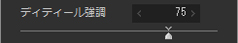 このパラメータを強くすると、はっきりとした輪郭をあまり強めることなく、ディティールの解像感を上げることができます。 ただし、ノイズも同時に強調されやすいので、ノイズとのバランスを見ながら調整してください。 ※ディティールの強調具合は、輪郭強調のパラメータとの両方で決まります。輪郭強調を弱めた場合には、ディティールの強調も同時に弱くなるようになっています。まず大まかに(1)輪郭強調のパラメータを設定した後で調整してください。