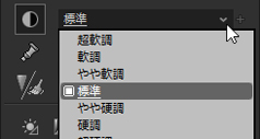 4.5. 調子 コントラストやガンマを調整して、画像の軟調、硬調を調整します。 他の補正の調整が終わった上での微調整をおこなう場合は、「トーンカーブ」を使用します。 4.5.1. テイストからの選択 調子・テイストに登録されたテイストを選択します。 メーカーテイストとして、軟調~硬調までの調子を段階的に用意してあります。 「標準」はSILKYPIXの初期の設定です。「標準」は、sRGBやAdobe RGBの基準トーンカーブよりコントラストが高く、見栄えがよくなるように設定されています。 「忠実」を選択すると、sRGBやAdobe RGBの基準トーンカーブの通りの調子表現となります。 4.5.2. 調子の調整 調子の調整は、コントラスト、コントラスト中心、ガンマ、および黒レベルの4つのパラメータでおこないます。